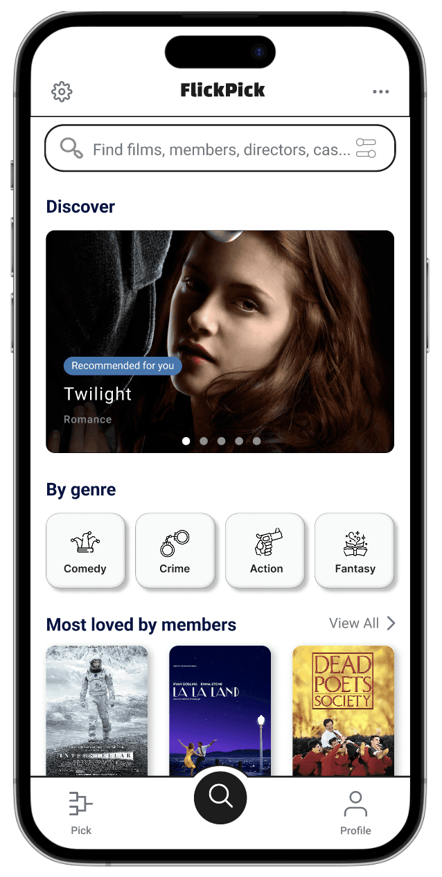FlickPick is a mobile app designed to make choosing what to watch feel easier and more fun. Instead of browsing long lists, users decide through a structured, tournament style flow that works both solo and with friends, balancing playful interaction with practical tools for discovery and reflection.