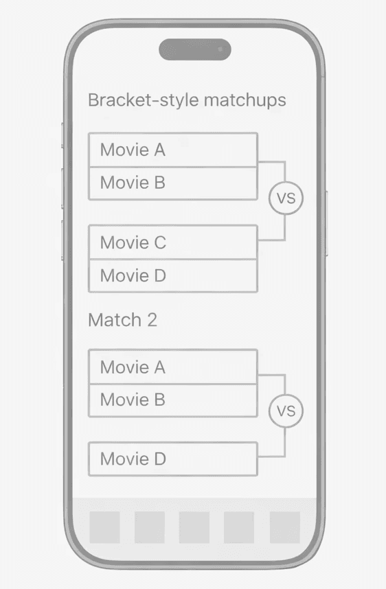 Movies are presented in head to head comparisons. Each choice narrows the pool until a single winner remains.