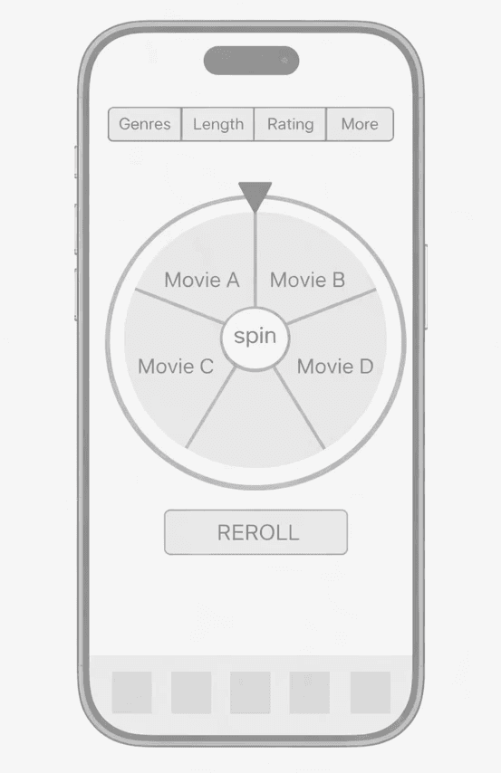 A randomized wheel selects a movie from a filtered set. Users can re-spin if the result doesn’t feel right.