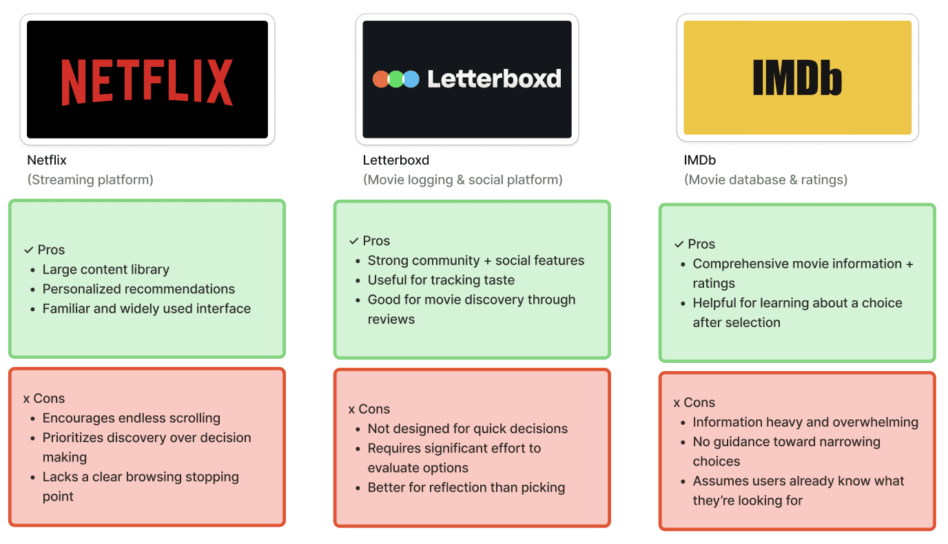 I analyzed common movie discovery and streaming platforms to understand how existing products support movie selection and where they fall short in helping users decide.