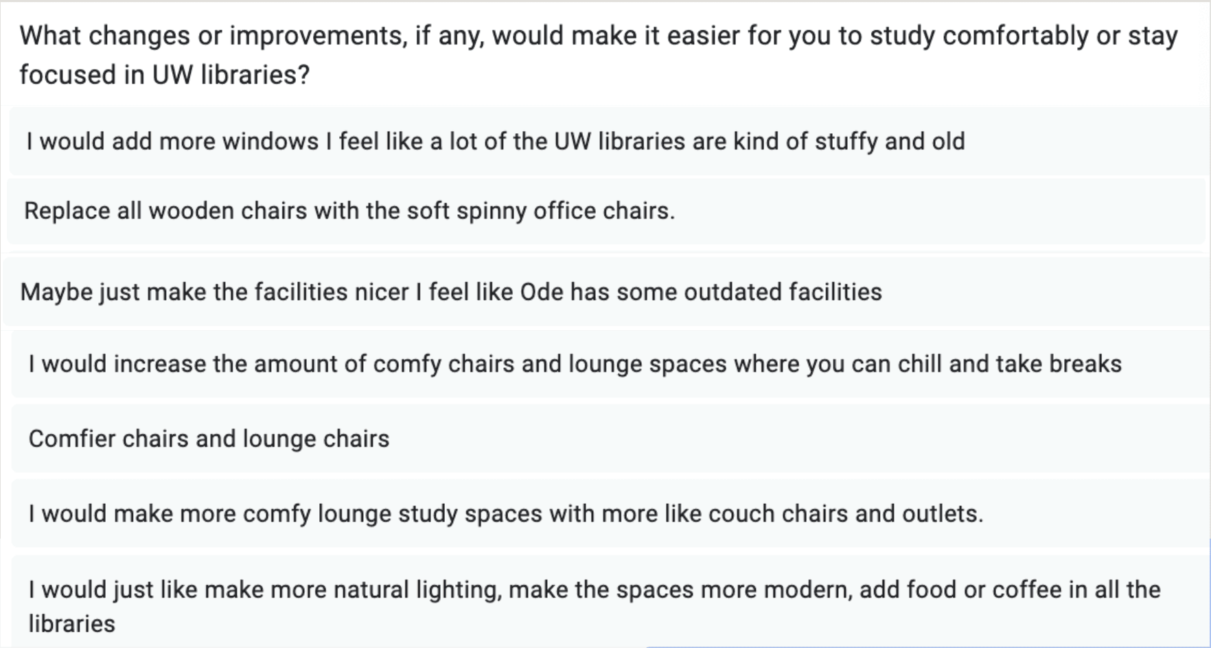 What surprised me: How consistently students asked for more modernized, comfortable spaces across open-ended responses