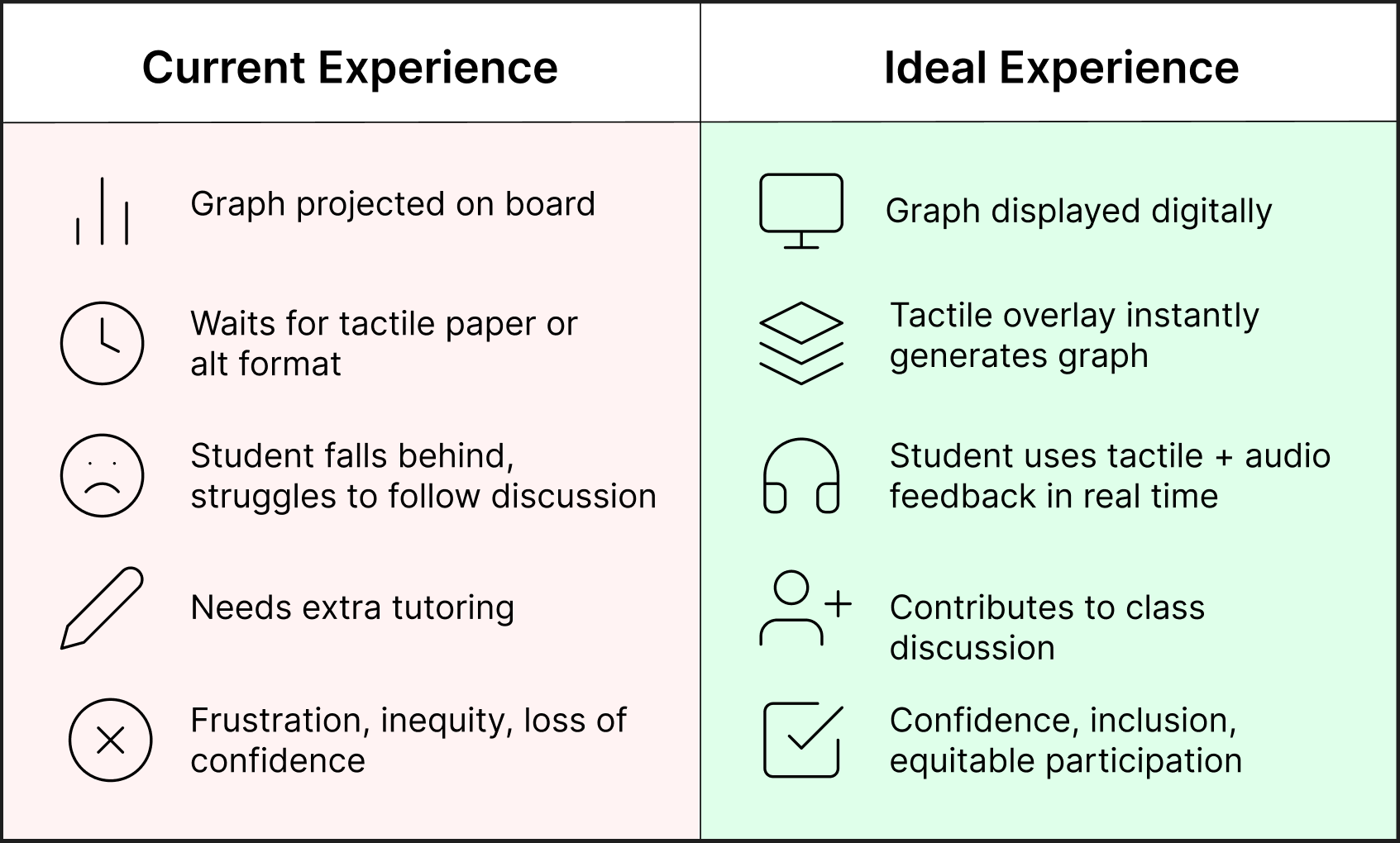 User Journey Map: Current vs. Ideal classroom experience, showing how accessibility gaps create delays